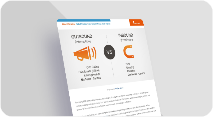 Inbound Marketing - 10 Best Practices Every Marketer Should Know and Use OUTBOUND INBOUND (Interruption) (Permission) VS Cold Calling SEO Cold Emails (SPAM) Blogging Interruptive Ads Attraction Marketer - Centric Customer - Centric Image source: DigDev Media For many B2B companies, inbound marketing is already the preferred marketing method for attracting and communicating with customers. In a world oversaturated with information, useful and engaging content has proven to be one of the most effective ways to reach out to target audiences. Traditional marketing and advertising hacks are becoming a thing of the past as audiences evolve. In fact, 80 percent of business decision makers say that they’d prefer to get information about brands and their products through a series of articles than through conventional ads. The modern customer is more informed than ever and cheap advertising messages simply don’t work like they used to. Instead of forcing ad messages on people, inbound focuses on creating valuable content assets on owned media such as company websites and blogs. Content is then distributed in the right way—and at the right time—so that it achieves the maximum impact on target audiences and brings in new customers. The efficacy of inbound marketing is proven by the statistics. B2B businesses that employ blogging report that their lead generation has increased by 67 percent per month. 87 percent of B2B marketers say they use social media to distribute content, and 91 percent of them have embraced the use of content as a whole. Created by inSegment www.insegment.com 2